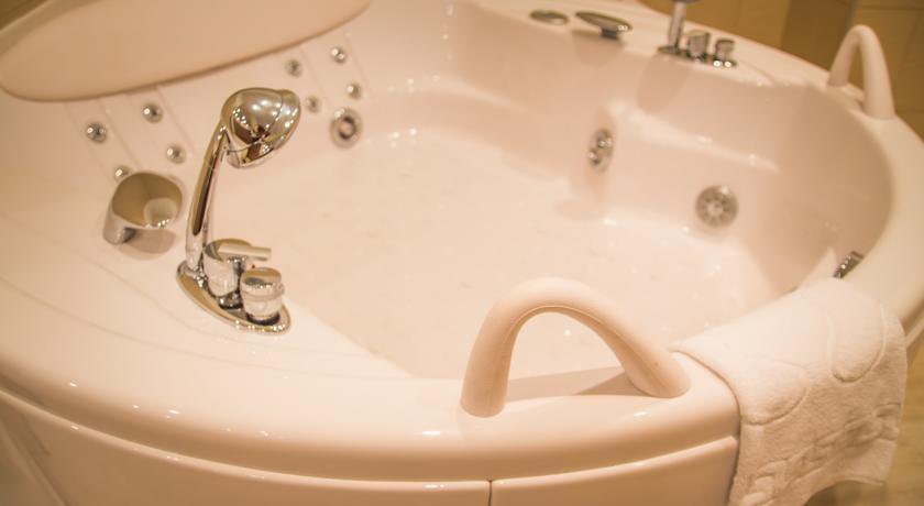 Большой стильный номер с гидромассажной ванной, телевизором с плоским экраном и диваном.